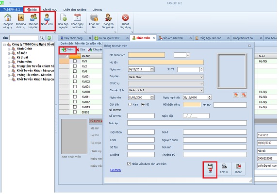 Chọn Nhân Viên -> chọn Thêm -> Hiển thị bảng Thông tin nhân viên -> thực hiện điền thông tin nhân viên : Mã nhân viên, Họ tên, Bộ Phận, Ca mặc định, Mã chấm công – mã chấm công là số không có chữ và k có số 0 đằng trước, trùng với số ID dưới máy chấm công -> Sau đó ấn Lưu để lưu lại thông tin nhân viên.